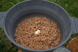 Первоначально нужно поставить котелок на слабый огонь и растопить в нем сливочное масло. После масло смешиваем с сушеным луком, перцем и помидорами. Немного прогреваем сушеные овощи в масле, после чего засыпаем гречку, и немного солим. Заливаем это все водой, накрываем крышкой и оставляем это все на 10-15 минут. А пока гречка будет вариться, мы займемся соусом. Для соуса нам необходимо яичный порошок развести в теплой воде, до консистенции напоминающего жидкое тесто. Сыр мелко режем (можно натереть) и смешиваем с яичным соусом. В соус можно добавит приправы, которые вам больше всего нравятся.