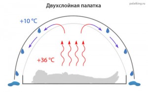 Сразу же скажем, что образование конденсата напрямую связано с разницей температуры внутри палатки и снаружи. Ясно, что температура воздуха снаружи ниже, чем внутри палатки, поэтому влага из выдыхаемого нами воздуха, соприкасаясь с тентом, превращается в воду. Подсчитано, что в течение ночи в среднем каждый человек выделяет где-то 300 гр. влаги – часть через дыхание, часть через кожу. Именно эта влага и оседает на внутренней стороне тента.
