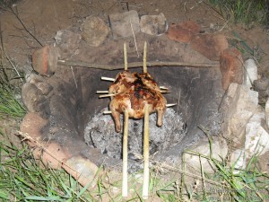 Жарка мяса на шпажках проводится на прогоревших углях, пламя можно пригасить оставшимся маринадом, взбрызгивая на мясо и угли. Куски прижимаем как можно ближе друг к другу, не оставляя промежутки, чтобы не прогорала шпажка. Края прутков можно класть на края камней, периодически поворачивая для обжарки куски.